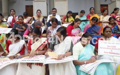 Karnataka Women congress wing led by its President Pushpa Amarnath, MLA Sowmya Reddy staged a protest by holding post cards and posting the card to Central Election Commission office to abolish EVM (Electronic Voting Machine), the protest was held at GPO, in Bengaluru on Wednesday 26th June 2019