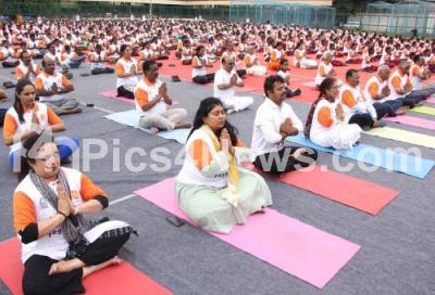 Photo Caption : MLA Sowmya Reddy, Charkravarty Sulibel, Tejaswini Ananth Kumar, Councilor Nagaraj and Yoga enthusiasts performing Yoga during "Yoga Hive" to mark International Yoga Day at Kittur Rani Chennamma Grounds, Jayanagar, in Bengaluru on Wednesday 26th June 2019