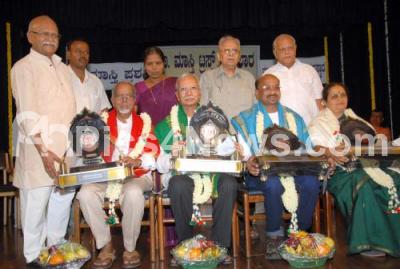 Photo Caption : Nadoja Dr Hampa Nagarajaiah presenting "Maasti" award to Dr K Marulasiddapppa, Eshwar Chandra, Savitha Nagabhushana and Dr Mogalli Ganesh during award presentation program organised by Dr Maasti Venkatesha Iynger Trust at Bharatiya Vidya Bhavan, also seen are Dr GS Siddalingaiah, KM Janaki, Director, Kannada and Culture Dept and Mavinekere Ranganathan, in Bengaluru on Saturday 29th June 2019