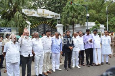 Photo Caption : Rebel Congress and JDS MLAs seen outside Rajbhavan after submitting their resignations to Governor of Karnataka,Vajubhai Vala, in Bengaluru on Saturday 6th July 2019