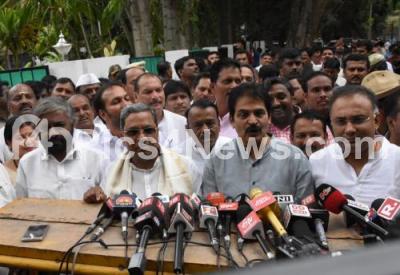 Photo Caption : Siddaramaiah, Former CM and Congress leader with KC Venugopal, Congress Karnataka Incharge, Dinesh Gundu Rao, KPCC President and others addressing a press conference on the political developments in Karnataka State at DCM Office, Sadashivanagar, in Bengaluru on Monday 8th July 2019