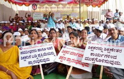 Member of Karnataka State Primary School Teachers Association, Bangalore staging a protest at Gandhi Statue, Anand Rao Circle, to press their various demands, in Bengaluru on Tuesday 9th July 2019