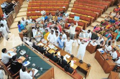 Photo Caption : Congress and JDS Councilors protest demonstration against alleged Operation Kamala and horse trading of BJP during special BBMP council meeting at BBMP, in Bengaluru on Tuesday 9th July 2019