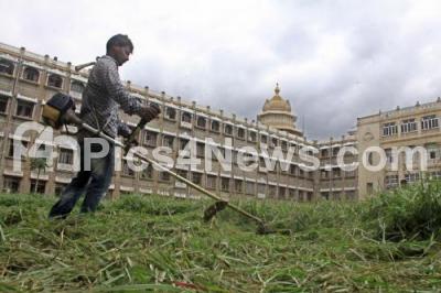 Photo Caption : A worker cutting grass at Vidhana Soudha premises, following political developments in Karnataka State, in Bengaluru on Thursday 11th July 2019
