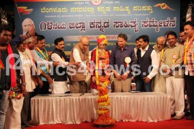 Photo Caption : Baraguru Ramchandrappa seen with HG Someshkhar Rao, Senior Film Artist, Mayanna, President Bengaluru District Kannada Sahitya Parishat and others seen during the 14th District Kannada Sahitya Sammelana at Ravindra Kalakshetra, in Bengaluru on Saturday 13th July 2019