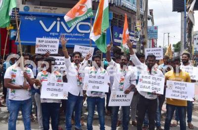 Event Description : Members of Youth Congress protesting against the horse trading tactics of BJP, in Bengaluru on Sunday 14th July 2019