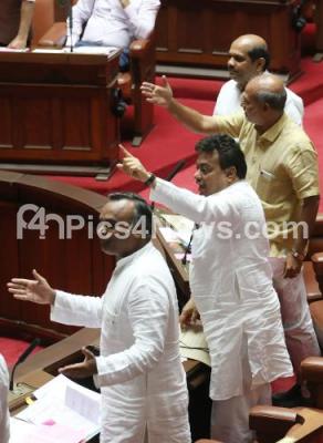 Photo Caption : Home Minister MB Patil with Ministers Priyank Kharge, Sa Ra Mahesh and Bandeppa Kashempur arguing at Council Session at Vidhana Soudha, in Bengaluru on Monday 15th July 2019
