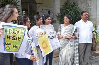 Photo Caption : Mayor Gangambike Mallikarjuna and Deputy Mayor Bhadregowda interacting with college students during inauguration of "E Waste" collection drive at BBMP, in Bengaluru on Monday 15th July 2019