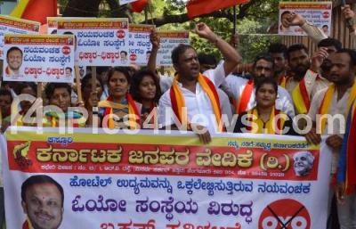 Event Description : Members of Karnataka Janapara Vedike staged a protest against the OYO Hotels, the protest was held at SBM Circle, in Bengaluru on Tuesday 16th July 2019