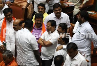 Photo Caption : Congress and BJP MLAs seen in a conversation during the leisure time of the Assembly Session at Vidhana Soudha, in Bengaluru on Monday 22nd July 2019