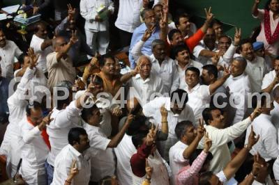 Photo Caption : BJP State President BS Yeddyurappa and BJP MLAs flash victory sign after the trust vote at the Assembly Session at Vidhana Soudha, in Bengaluru on Tuesday 23rd July 2019