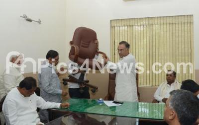 Photo Caption : Dinesh Gundu Rao, KPCC president seen passing a chair to other congress legislatures during a meeting at KPCC Office, in Bengaluru on Wednesday 24th July 2019