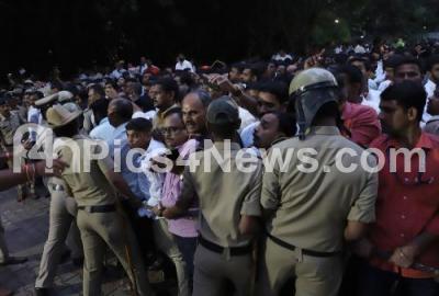 Photo Caption : BJP workers and supporters of CM BS Yediyurappa seen celebrating during the chief Minister of Karnataka swearing in ceremony at Raj Bhavan, in Bengaluru on Friday 26th July 2019