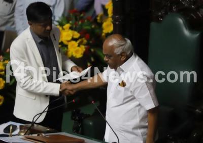 Photo Caption : Ramesh Kumar handing over the resignation letter to deputy speaker Krishna Reddy from the speakers post of Assembly Session at Vidhana Soudha, in Bengaluru on Monday 29th July 2019