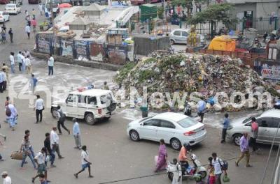 Photo Caption : People suffer to walk at footpath at KR Market due to garbage piled up, in Bengaluru on Friday 2nd August 2019