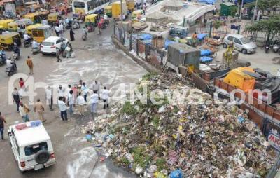 People suffer to walk at footpath at KR Market due to garbage piled up, in Bengaluru on Friday 2nd August 2019