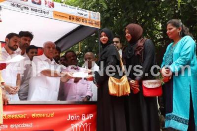 CM BS Yediyurappa, Sapthagiri Gowda, president Bangalore City Yuva Morcha with members of BJP Yuva Mrcha inaugurated the BJP Membership Campaign at BJP Office, Malleshwaram, in Bengaluru on Saturday 3rd August 2019