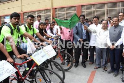 Photo Caption : Srinivasan, IAS, DC, Bengaluru City flagged off to inaugurate Bicycle rally from Bengaluru to Mysuru to create awareness on Save Water, organised by Seshadripuram Education Datti and Bengaluru Central University , also seen are Dr Wooday P Krishna, President, Karnataka Gandhi Smaraka Nidhi and NR Panditha Aradhya at Seshadripuram College, in Bengaluru on Monday 5th August 2019