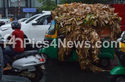 Photo Caption : Auto Rickshaw is completely covered with banana leaves, as rains lashed Bengaluru City on Thursday 8th August 2019