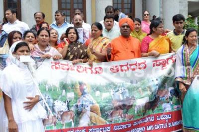 Photo Caption : Members of Vishwa Prani Kalyana Mandal participated in awareness campaign to Save Cow at Town Hall, in Bengaluru on Friday 9th August 2019