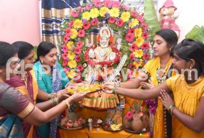 Photo Caption : Ladies offering pooja to Goddess Lakshmi on the occasion of "Varamahalakshmi Festival" at Vijaya Nagar, in Bengaluru on Friday 9th August 2019