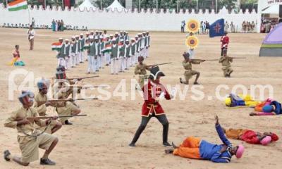 Photo Caption : Students enact a scene of Indian pre Independence era during the celebrations of 73rd Independence Day at Manekshaw Parade Grounds, in Bengaluru on Thursday 15th August 2019
