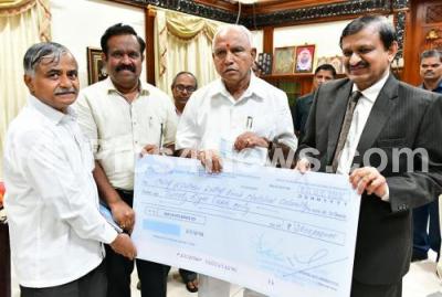 Photo Caption : CM BS Yediyurappa receiving a cheque for the floods relief fund from the team of Jayadeva Hospital , led by Dr Manjunath, Director, Jayadeva Hospital, the program was held at Vidhan Soudha, in Bengaluru on Monday 19th August 2019