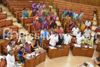 Photo Caption : Congress and BJP councilors seen arguing during the BBMP special council meeting at BBMP Head Office, in Bengaluru on Monday 19th August 2019