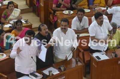 Photo Caption : BBMP Opposition leader Padmanabaa Reddy and other BJP councilors arguing during BBMP special council meeting at BBMP Head Office, in Bengaluru on Monday 19th August 2019