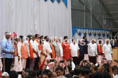 Photo Caption : Governor of Karnataka Vajubhai Vala, Chief Minister of Karnataka B S Yediyurappa with newly inducted Ministers CC Patil, Prabhu Chauhan, J C Madhu Swamy, H Nagesh, Kota Srinivas Poojari, S Suresh Kumar, Dr. Ashwath Narayan CN , Jolle Sashikala Annasaheb, Laxman Savadi, K S Eshwarappa, R Ashoka, Jagadish Shetter, Govind M Karjol, Sreeramulu, V Somanna, CT Ravi and Basavaraj Bommai during swearing ceremony at Raj Bhavan, in Bengaluru on Tuesday 20th August 2019