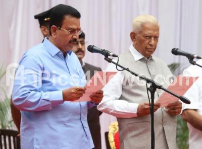 Photo Caption : Governor of Karnataka Vajubhai Vala administering oath to CC Patil during newly inducted Ministers swearing ceremony at Raj Bhavan, also seen is Chief Minister of Karnataka B S Yediyurappa, in Bengaluru on Tuesday 20th August 2019