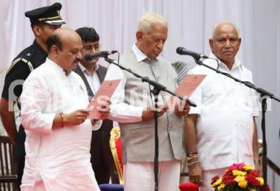 Photo Caption : Governor of Karnataka Vajubhai Vala administering oath to Basavaraj Bommai during newly inducted Ministers swearing ceremony at Raj Bhavan, also seen is Chief Minister of Karnataka B S Yediyurappa, in Bengaluru on Tuesday 20th August 2019