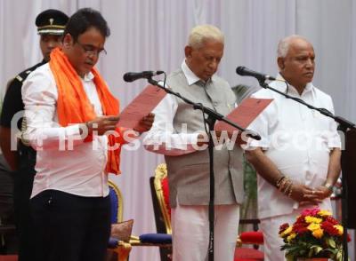 Photo Caption : Governor of Karnataka Vajubhai Vala administering oath to Dr Ashwath Narayan CN during newly inducted Ministers swearing ceremony at Raj Bhavan, also seen is Chief Minister of Karnataka B S Yediyurappa, in Bengaluru on Tuesday 20th August 2019