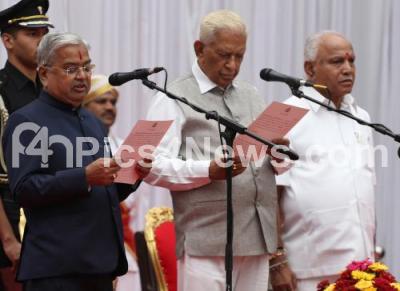 Photo Caption : Governor of Karnataka Vajubhai Vala administering oath to Govind Karjol during newly inducted Ministers swearing ceremony at Raj Bhavan, also seen is Chief Minister of Karnataka B S Yediyurappa, in Bengaluru on Tuesday 20th August 2019