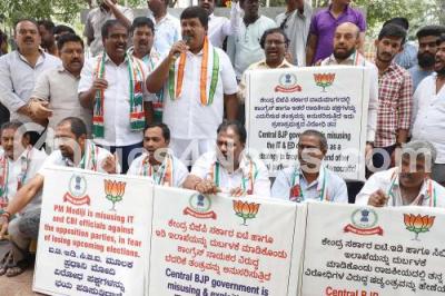 Photo Caption : Members of Bangalore City Youth Congress protesting against Central Government for misusing of IT and CBI officials against the opposition party MLAs, the protest was held at Gandhi Statue, Anand Rao Circle, in Bengaluru on Friday 30th August 2019