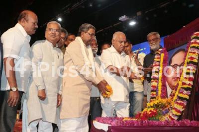 Photo Caption : Chief Minister of Karnataka BS Yediyurappa with Former CM Siddaramaiah, DCM Govind M Karjola, JDS State President HK Kumarswamy and others offering floral tribute to Dr BR Ambedkar portrait during awareness program on financial developments for SC ST community at Ambedkar Bhavan, in Bengaluru on Thursday 19th September 2019