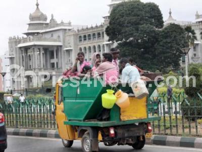 Photo Caption : Daily labourers travelling in a BBMP garbage dumping vehicle in front of Vidhan Soudha, in Bengaluru on Friday 20th September 2019