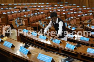 Photo Caption : BBMP officials seen preparing the council hall for the Mayor Elections at BBMP Head, in Bengaluru on Monday 30th September 2019
