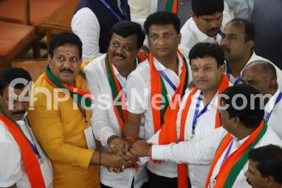 Photo Caption : Newly elected Mayor M Goutham Kumar and Deputy Mayor Ram Mohan Raju being greeted by BJP MLAs and Councilors during BBMP Mayor and Deputy Mayor Elections at BBMP, in Bengaluru on Tuesday 1st October 2019