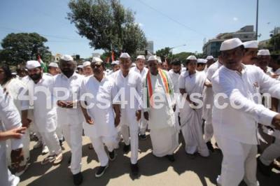 Photo Caption : Karnataka Congress leaders Siddaramaiah, Dr G Parameshwar, Dinesh Gundu Rao and others paid tribute to Mahatma Gandhi Statue and participated in the Sadbhavana Rally from KPCC Office on the occasion of Gandhi Jayanti, in Bengaluru on Wednesday 2nd October 2019