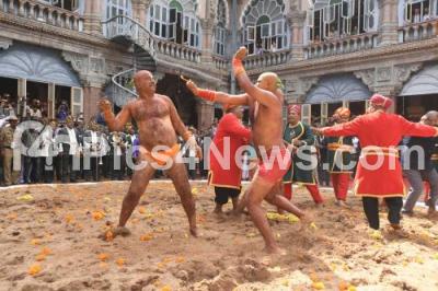 Photo Caption : “Vajramushti Kalaga†(wrestlers) participants in action as part of the Vijayadashami celebrations at Mysuru Palace, in Mysuru on Tuesday 8th October 2019