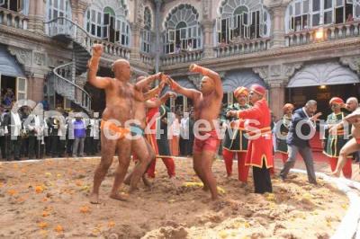 Photo Caption : “Vajramushti Kalaga†(wrestlers) participants in action as part of the Vijayadashami celebrations at Mysuru Palace, in Mysuru on Tuesday 8th October 2019