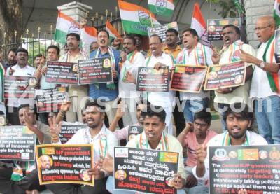 Photo Caption : Members of Bengaluru City Youth Congress protesting at MG Statue, Anand Rao Circle, against Central Government for misusing IT, ED and CBI departments and seeking justice for Ramesh, Personal Assistant of Dr G Parameshwar, who committed suicide after IT officials enquiry, in Bengaluru on Sunday 13th October 2019