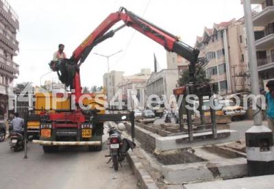 Photo Caption : Hi tech vehicles being used to keep slabs on the open drainage at Jayamahal road, Shivajinagar, in Bengaluru on Sunday 13th October 2019