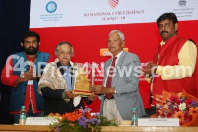 Photo Caption : Justice SR Bannurmath, Chairman of the Law Commission, GOK being felicitated by Mariswamy, Retd DGP, GoK during "XII National Cyber Defense Summit 2019" at Dr BR Ambedkar College, also seen are Dr E Khalieraaj, Additional Director General, National Cyber Safety and Security Standards, New Delhi and others, in Bengaluru on Friday 18th October 2019