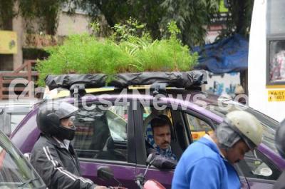 Photo Caption : Advocate Suresh has put saplings and plants on his car to create awareness on save nature and avoid air pollution, in Bengaluru on Tuesday 22nd October 2019