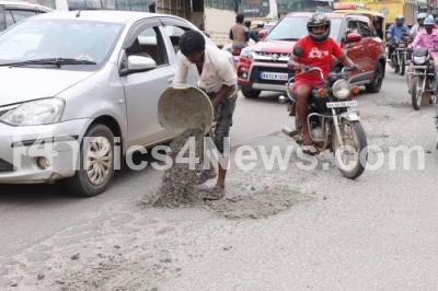 Photo Caption : Potholes being filled by workers at Magadi Road, in Bengaluru on Tuesday 29th October 2019