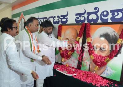 Photo Caption : Karnataka State Congress leaders DK Shivakumar, Dinesh Gundu Rao, BL Shankar and others offer floral tribute to Former PM Indira Gandhi, on her death anniversary and Sardar Vallabhbhai Patel, on his birth Anniversary program at KPCC Office, in Bengaluru on Thursday 31st October 2019