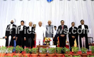 Event Description : Governor of Karnataka Vajubhai Rudrabhai Vala with Chief Minister of Karnataka BS Yediyurappa, Abhay Shreeniwas Oka, Chief Justice of Karnataka and new Additional Judges of the Karnataka High Court Justice Neranahalli Srinivasan Sanjay Gowda, Justice Jyoti Mulimani, Justice Nataraj Rangaswamy, Justice Hemant Chandangoudar and Justice Pradeep Singh Yerur during their swearing ceremony at Raj Bhavan, in Bengaluru on Monday 11th November 2019