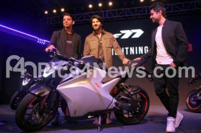 Photo Caption : Narayan Subramanian, Founder and CEO, Ultraviolette Automotive Pvt Ltd with Niraj Rajmohan, Founder and CTO, Ultraviolette Automotive Pvt Ltd and Actor Dulquer Salmaan at the launch of Ultraviolette Automotive F77 high performance electric motorcycle during a press conference at a private hotel, in Bengaluru on Wednesday 13th November 2019
